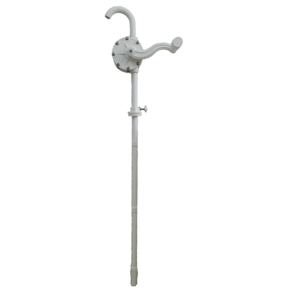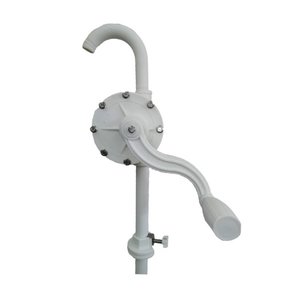 Bomba manual de transvase para adaptar a tambores de 15 a 55gls. Tipo rotativa, trabajo medio, en polipropileno sellos en viton para transvase de químicos, ácidos suaves, alcoholes, fluidos base agua, aditivos corrosivos, tubo de succión de 1″.