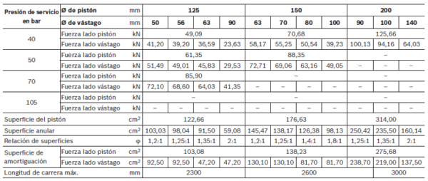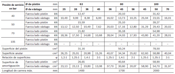 Presión de prueba estática (dependiendo de Ø de pistón y tipo de sujeción) bar [MPa]: Presión de servicio admisible x 1,3
