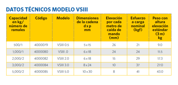 El polipasto manual de cadena modelo VSIII ha sido mejorado incorporando una serie de avances tecnológicos. Los rodamientos de alta calidad en los laterales, la tapa del engranaje y la nuez de cadena garantizan el perfecto funcionamiento de la nuez y del piñón.