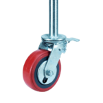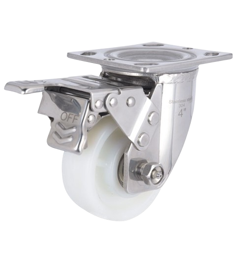 Tenedores fabricados en acero inoxidable AISI 304 y soldadura de acero inoxidable pulido brillante. Cuenta con esferas (inoxidables AISI 420B) y accesorios en acero inoxidable. Doble pista de esferas obtenidas por estampación. Disponibles con o sin freno, el freno delantero viene previamente instalado. El freno no se puede instalar en el sitio, en el eventual caso que se tengan los soportes sin freno.