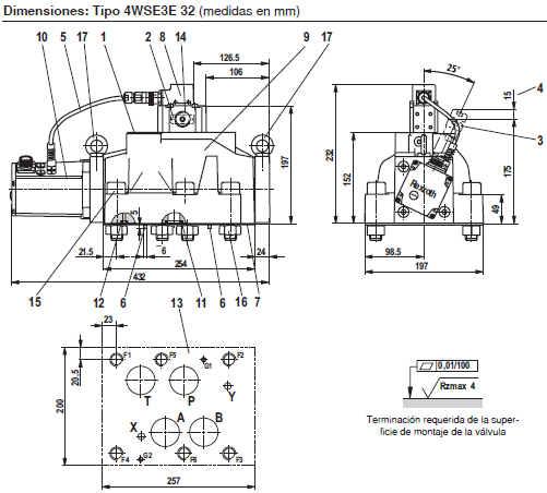 – Servoválvula de 3 etapas con regulación eléctrica de posición de la corredera de mando de la 3ra. etapa, detección de posición de la corredera de mando mediante un captador de posición inductivo
